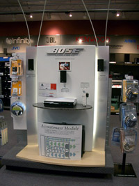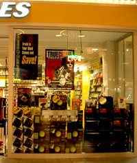 Магазин электроники Circuit City подчеркивает роль брендов поставщиков в своем магазине как размещая их лого над полками с товаром, так и и выставляя специальные стенды для отдельных брендов. Circuit City Morse Road, Columbus, 2003 |